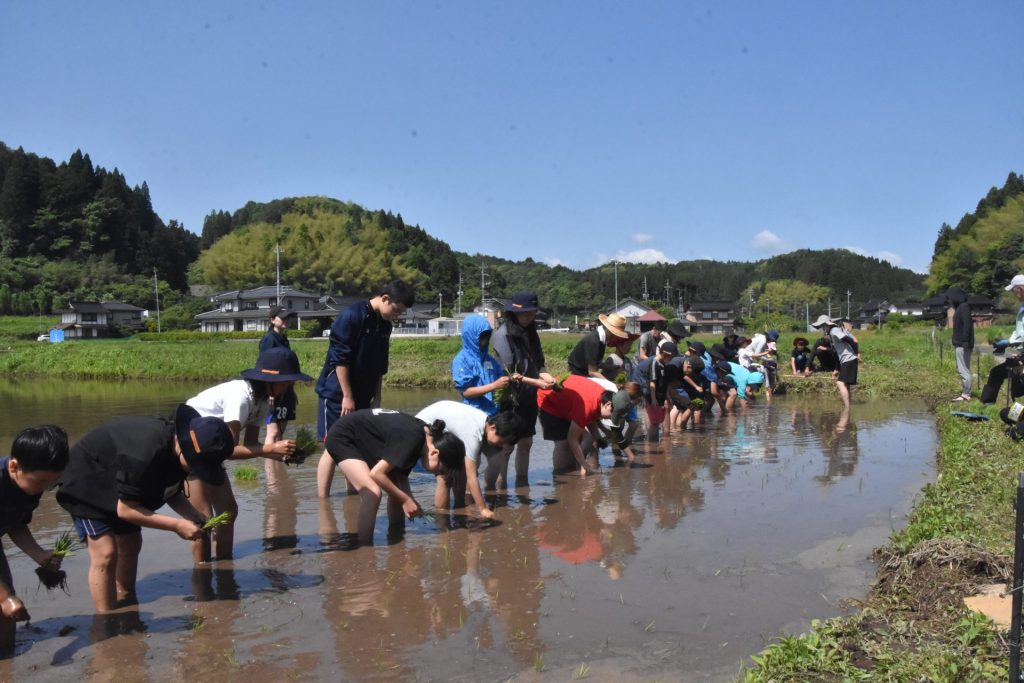 JA琴浦青壮年部員と一緒に親子で手植えによる田植え体験(もち米)を行います。田んぼで親子そろって一列になり、お米の苗を一つ一つ丁寧に手で植えました。