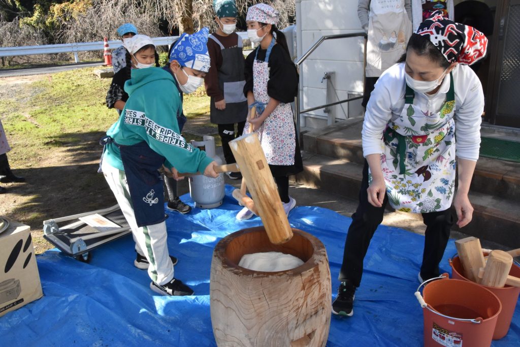 収穫したもち米でお餅をつき、「星空舞」でおにぎりを握りました。ごはんに合うように、グループに分かれ豚汁も作り、みんなで楽しくクッキングを楽しみました。