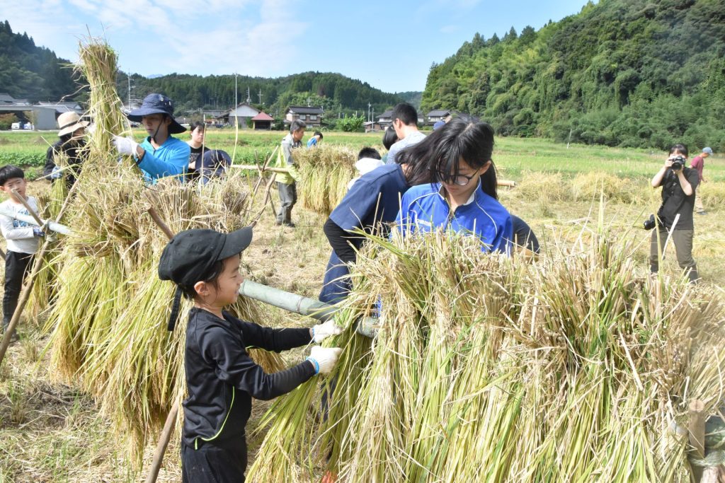 春に植えた稲が育ち、ついに収穫!カマを使って稲を刈り、束ねた稲を天日干しするはで掛けも行いました。