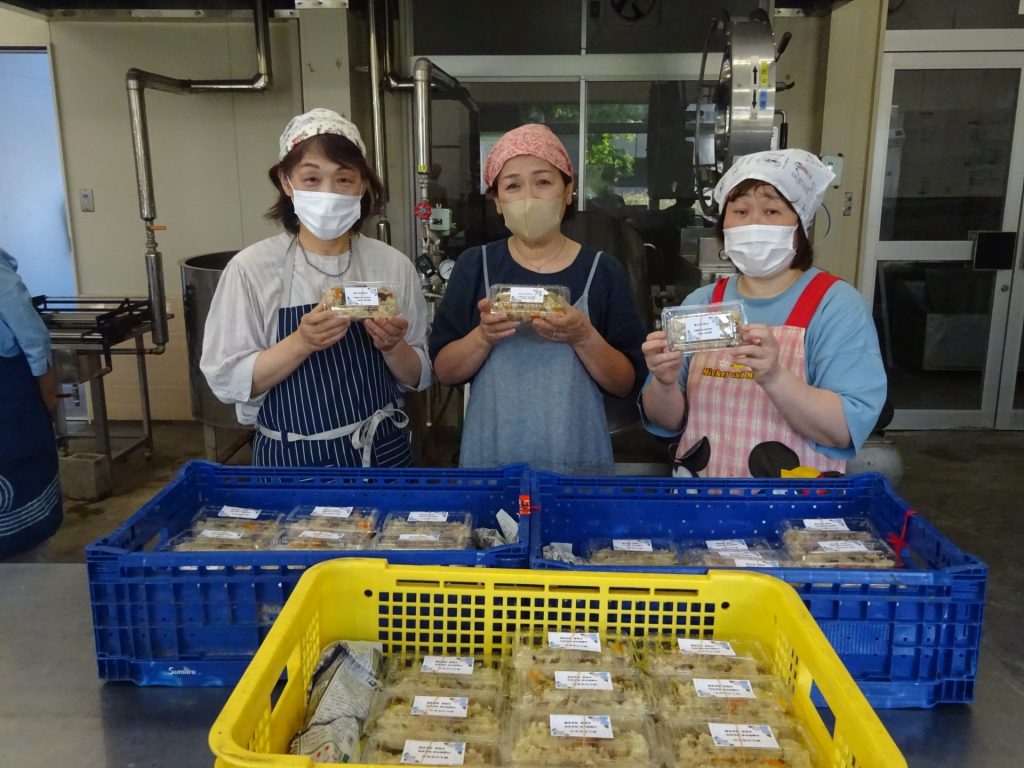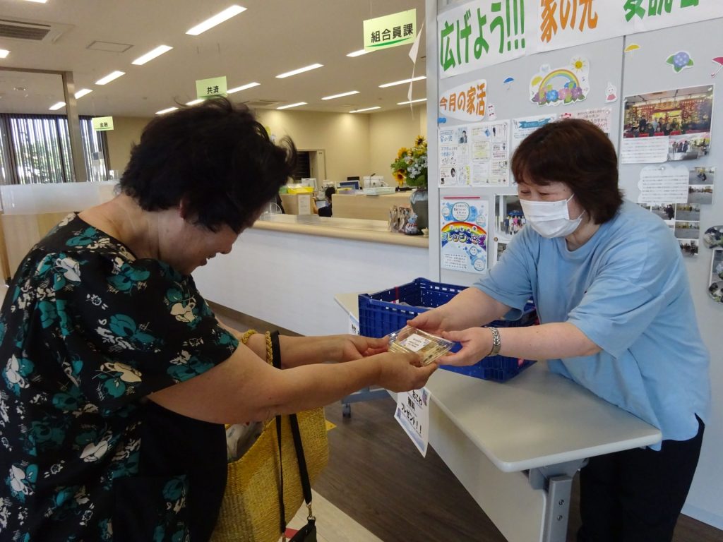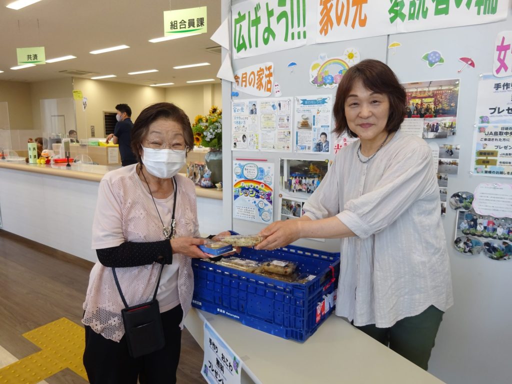 各支所で月に一度、来店者に日頃の感謝を込めてプレゼントなどを渡す「お客様感謝デー」と連携して開催。おこわは、会員の川本千賀子さんと石田千里さんの指導のもと9人が、地元で昔から伝わる「大塚おこわ」のレシピで調理。材料は直売所で買いそろえ地場産食材をふんだんに使用しました。