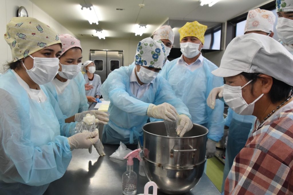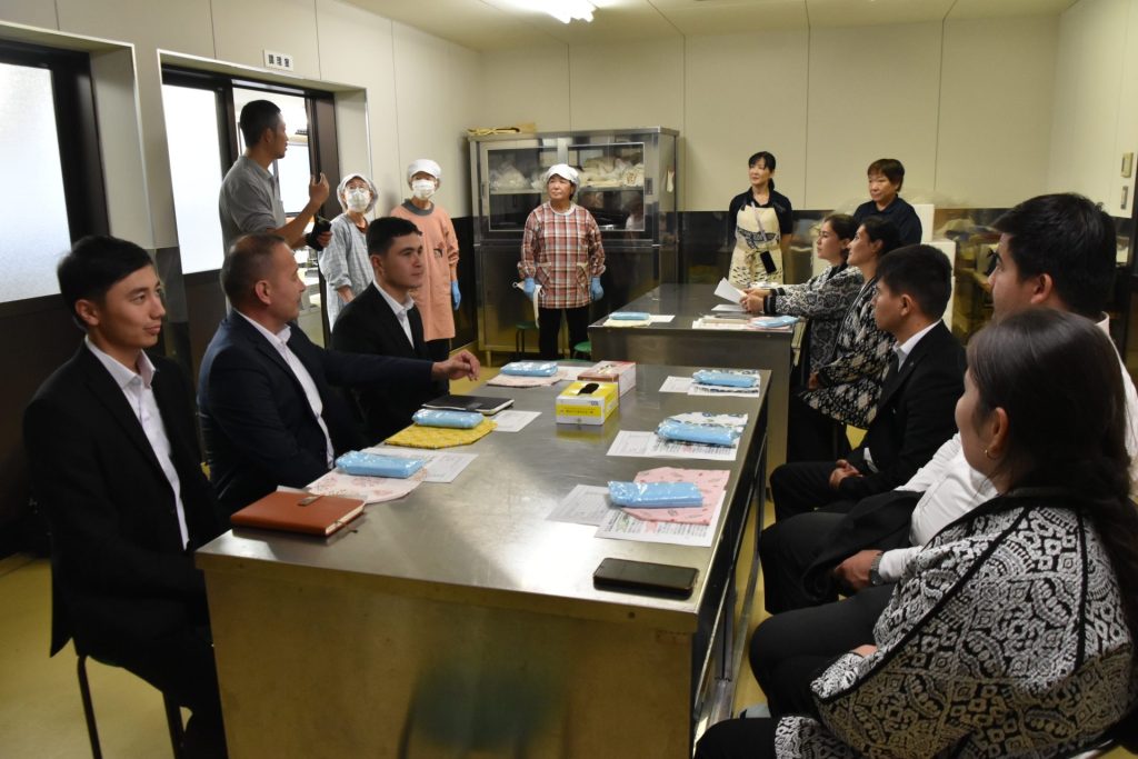 サマルカンド大の学生と教授8人と鳥大の教授が、北栄町の加工所サラダハウスを訪れました。