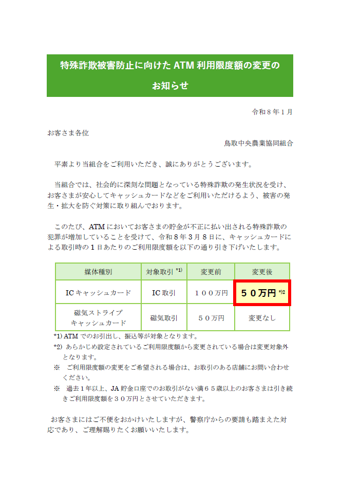 特殊詐欺被害防止に向けた ATM 利用限度額の変更のお知らせ