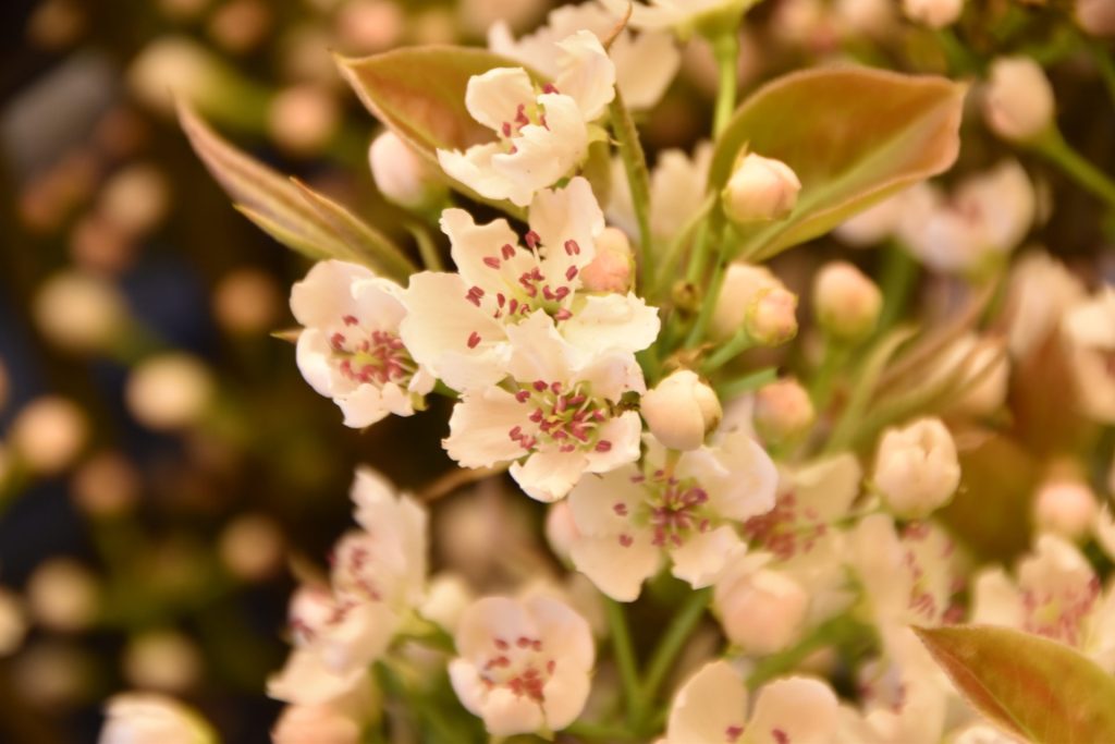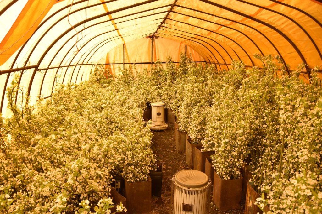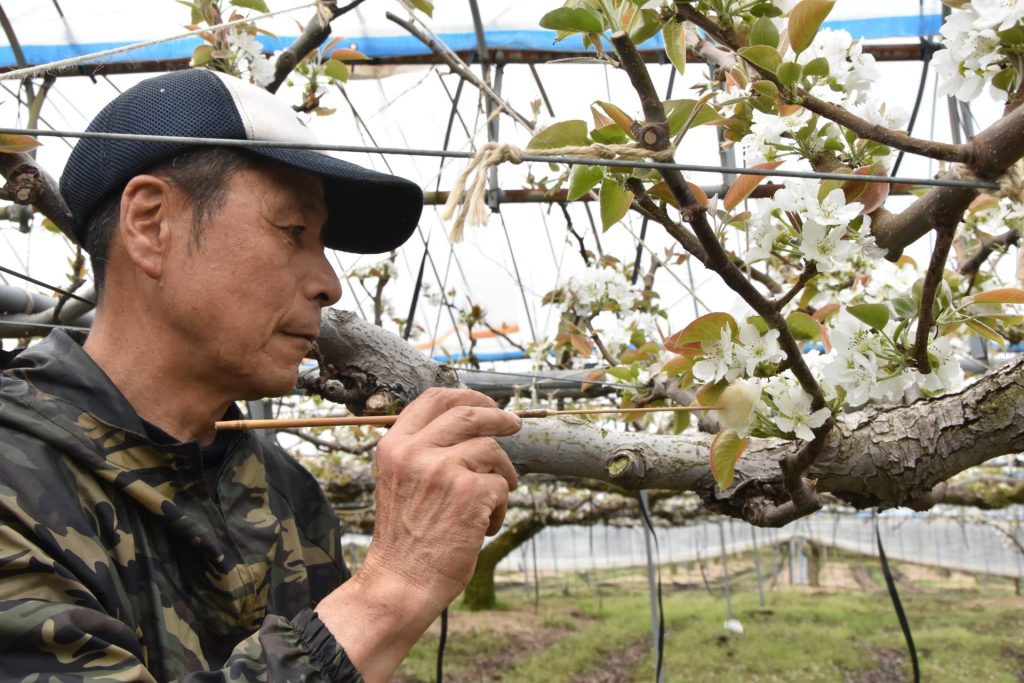琴浦梨生産部の藤井憲人部長の大型ハウス20aでは、5日に2回目となる交配作業が行われました。3月中旬のビニール被覆後、昨年ほどの高温ではなかったものの、平年並みの開花推移となりました。交配には昨年採取した「長十郎」の花粉。花粉を付けた「梵天」を手に、一輪ずつ手際よく花粉を付着させました。