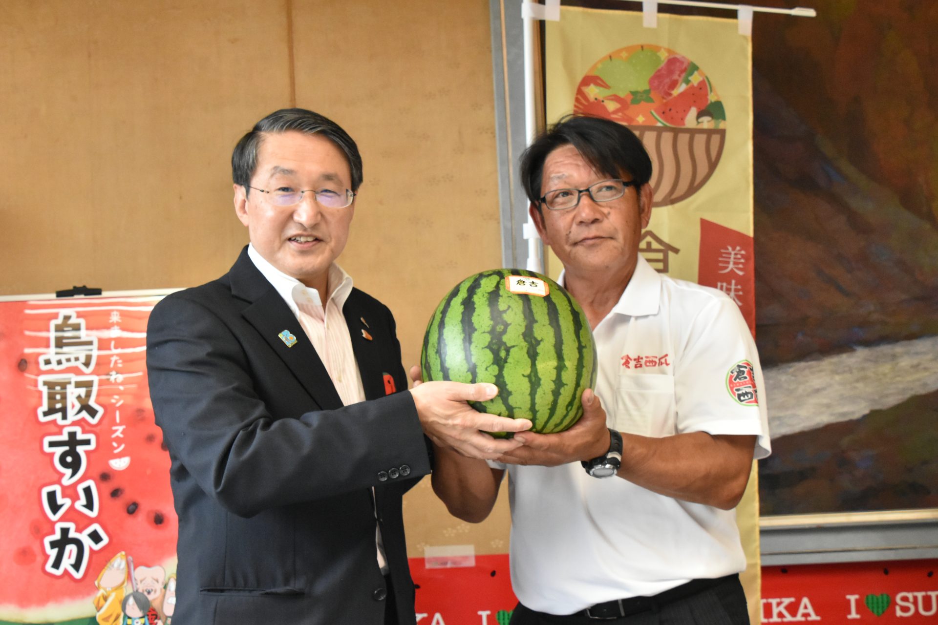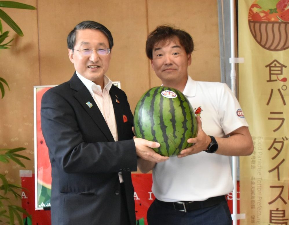 JA鳥取中央は、本格的に特産品のスイカの出荷が始まったことから、鳥取市の県庁で平井伸治知事を表敬訪問し、管内4つの地区で栽培される「鳥取スイカ」を贈呈しました。平井知事は、スイカを試食し、「今年はひときわ甘い」と太鼓判を押しました。