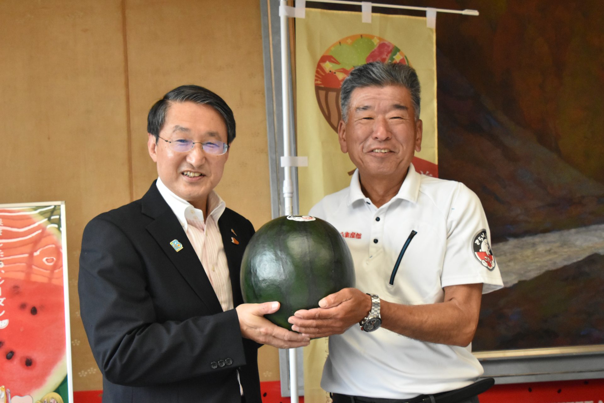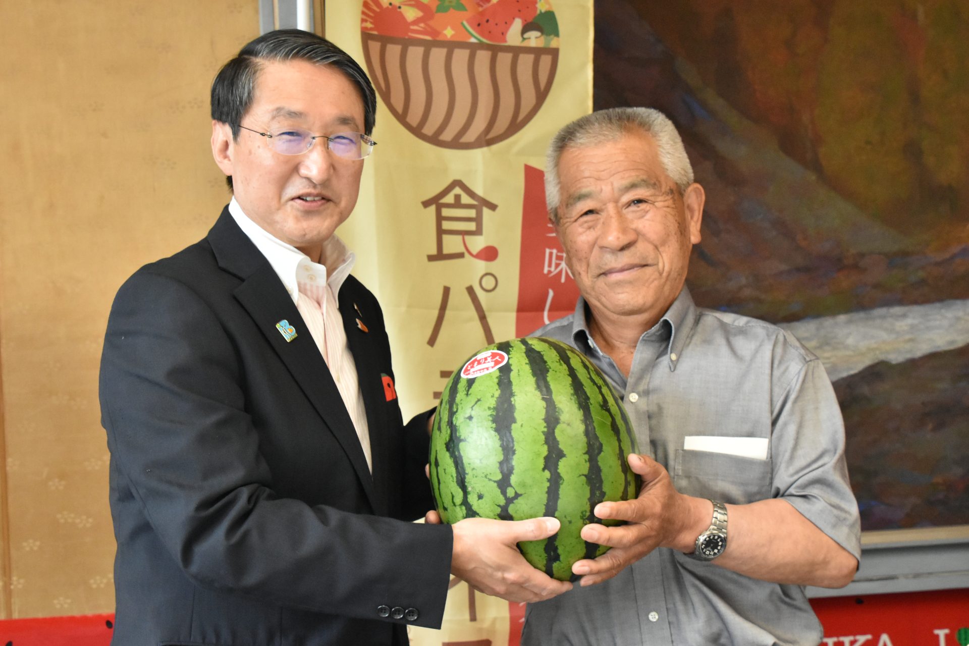 出席した向井敏弘専務は「5月下旬から出荷を開始し、例年になく糖度が高く、シャリ感もしっかりある上出来の仕上がりと、市場から高い評価も得ている。今年も引き続き情報発信をお願いしたい」と話し、平井知事は「生産者の皆さんの努力の結晶であるスイカをもって東京市場などに、売りに行く。県としても売り込みを強め、後押しをしていく」と強調しました。