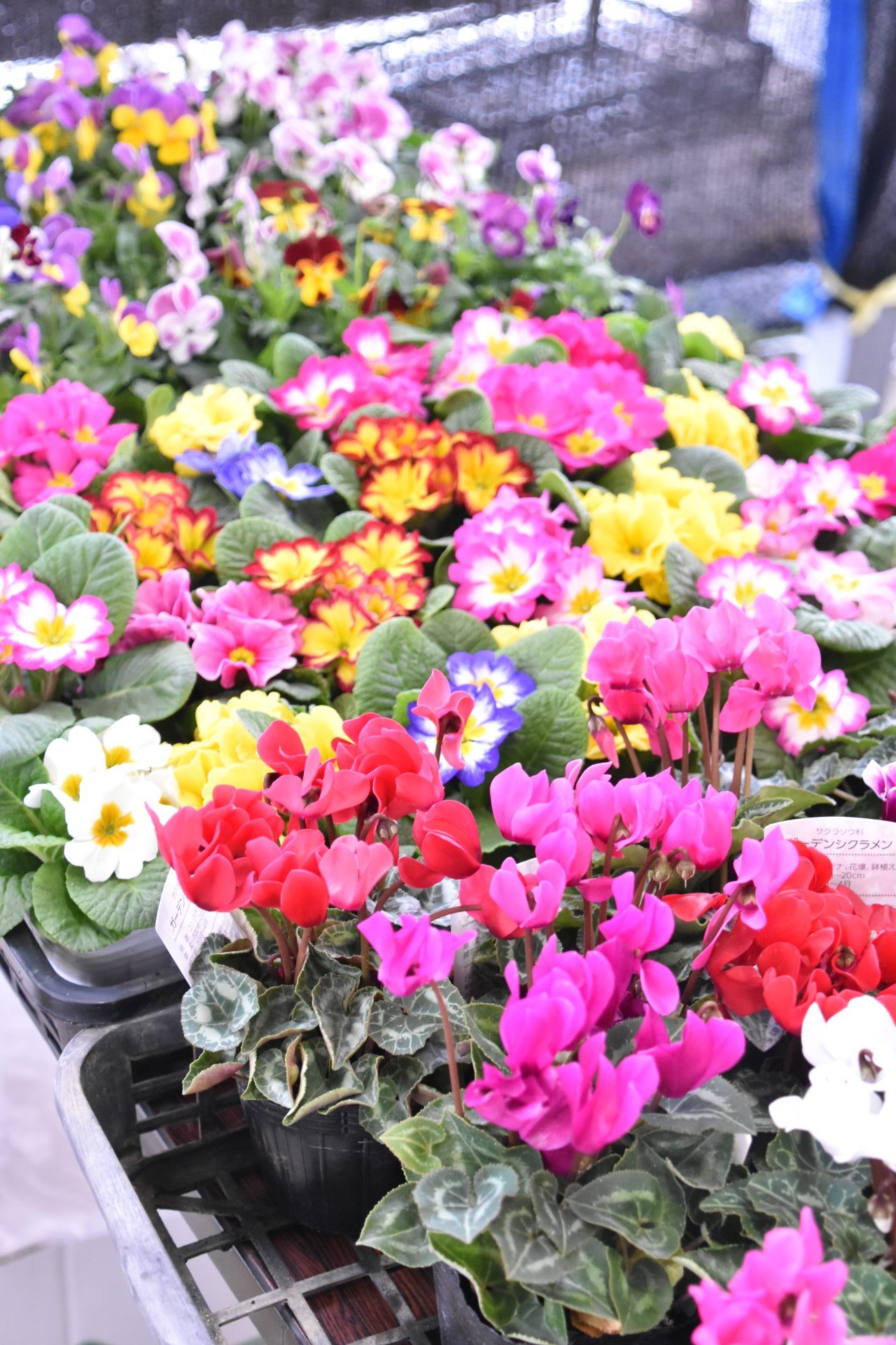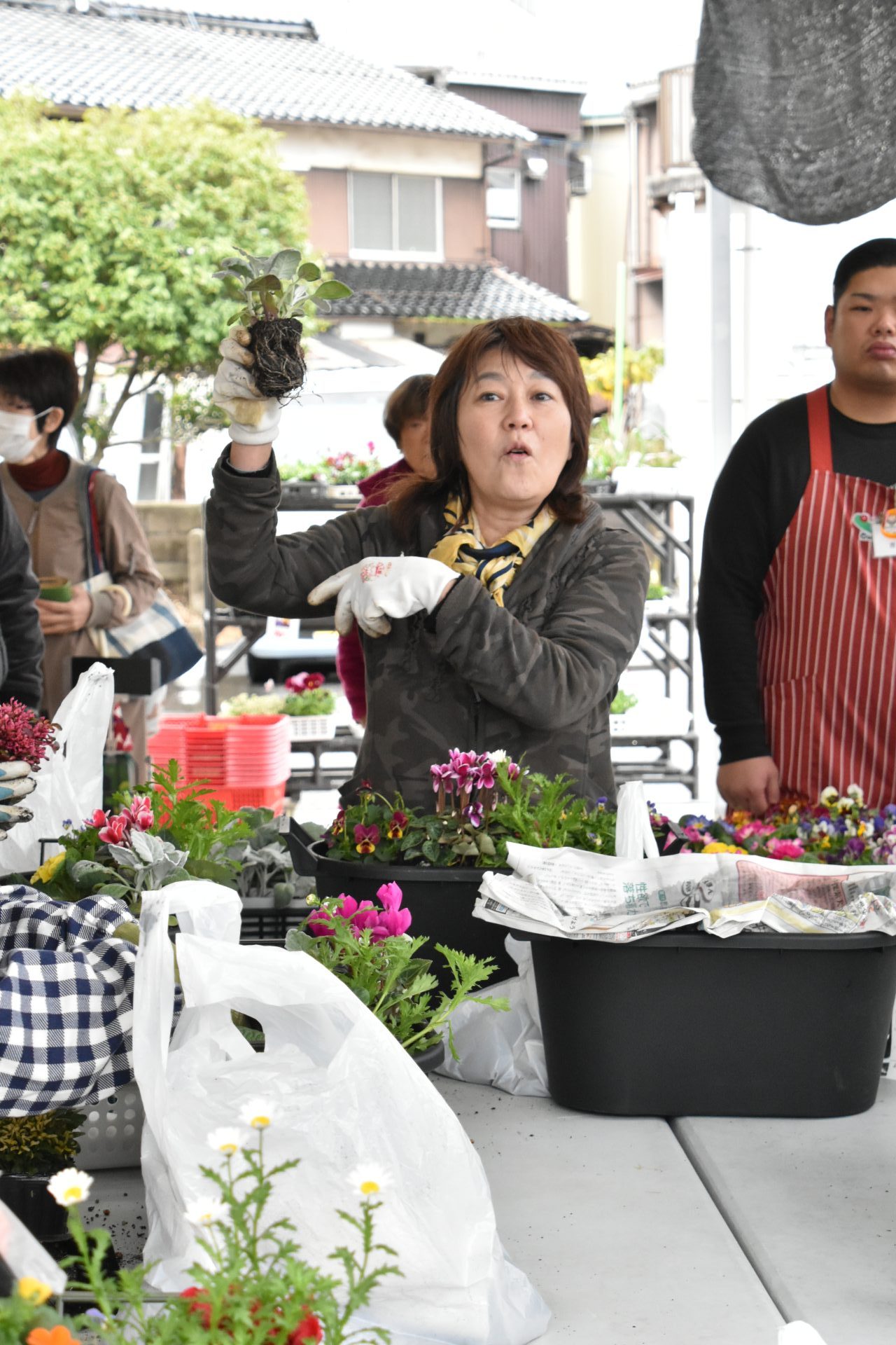 講師には谷本種苗の藤田昭子さんを招き、ガーデンシクラメンやプリムラジュリアンなど8品目の花を使い寄せ植えしました。防寒着に身を包み軍手をした手は紅潮しながらも、参加者たちは和気あいあいと明るい雰囲気で作業を進めました。