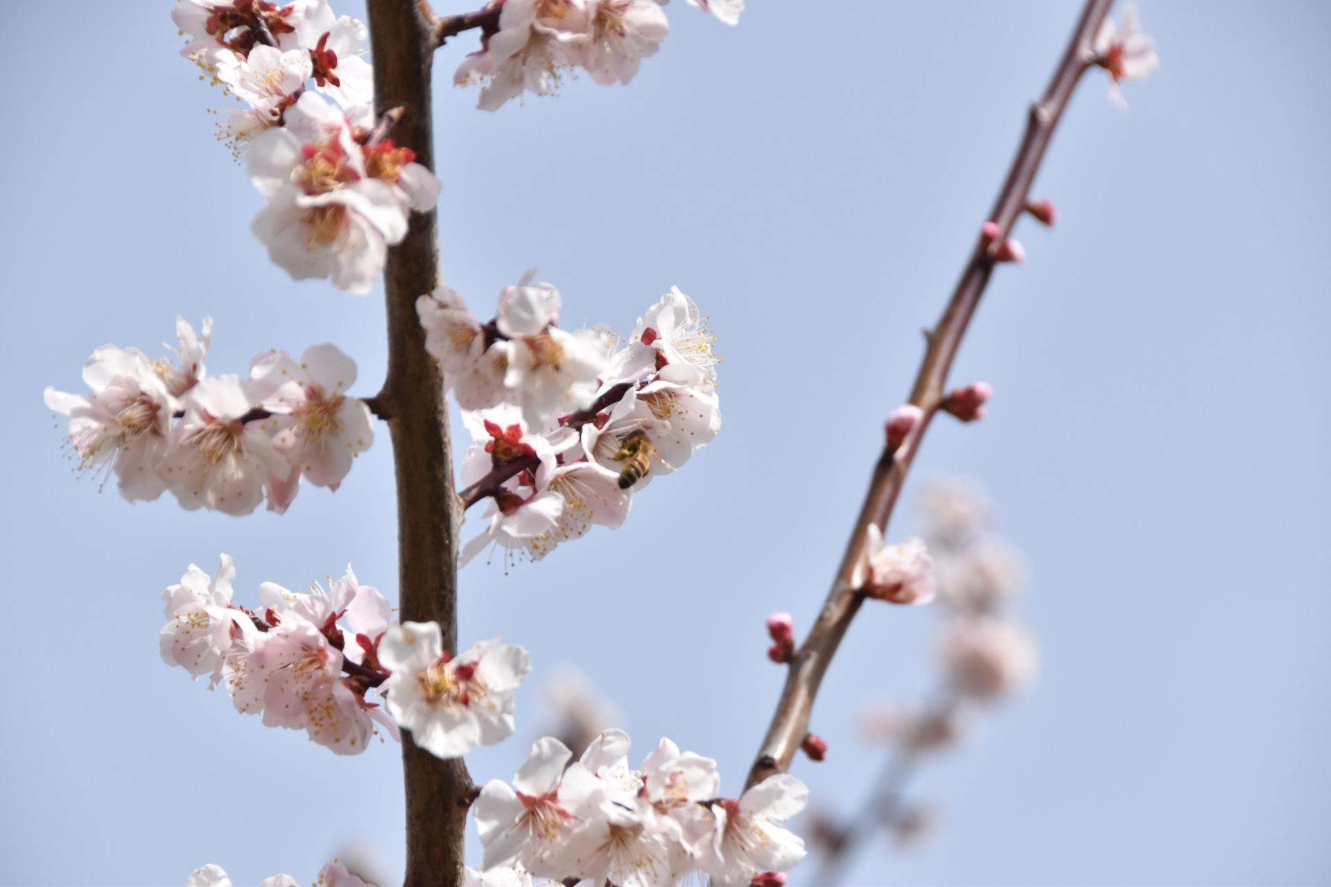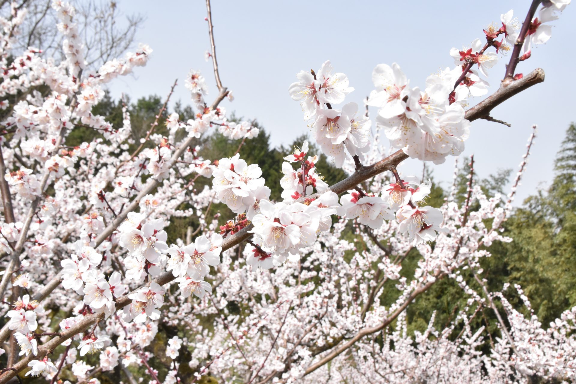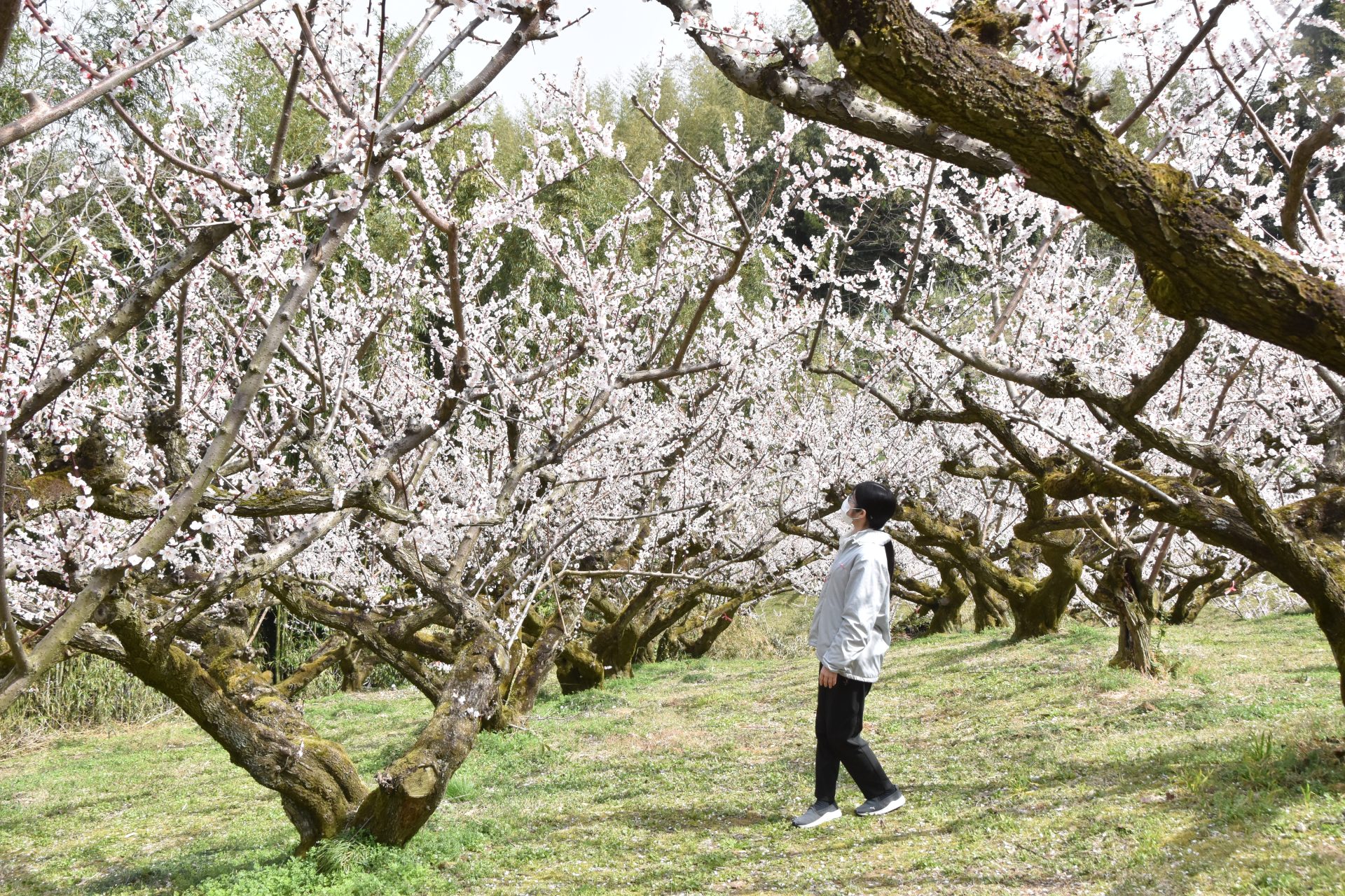 JA鳥取中央東郷果実部が栽培する「野花(のきょう)梅」の花が満開となり、園地を薄ピンクに染め甘い香りを漂わせています。