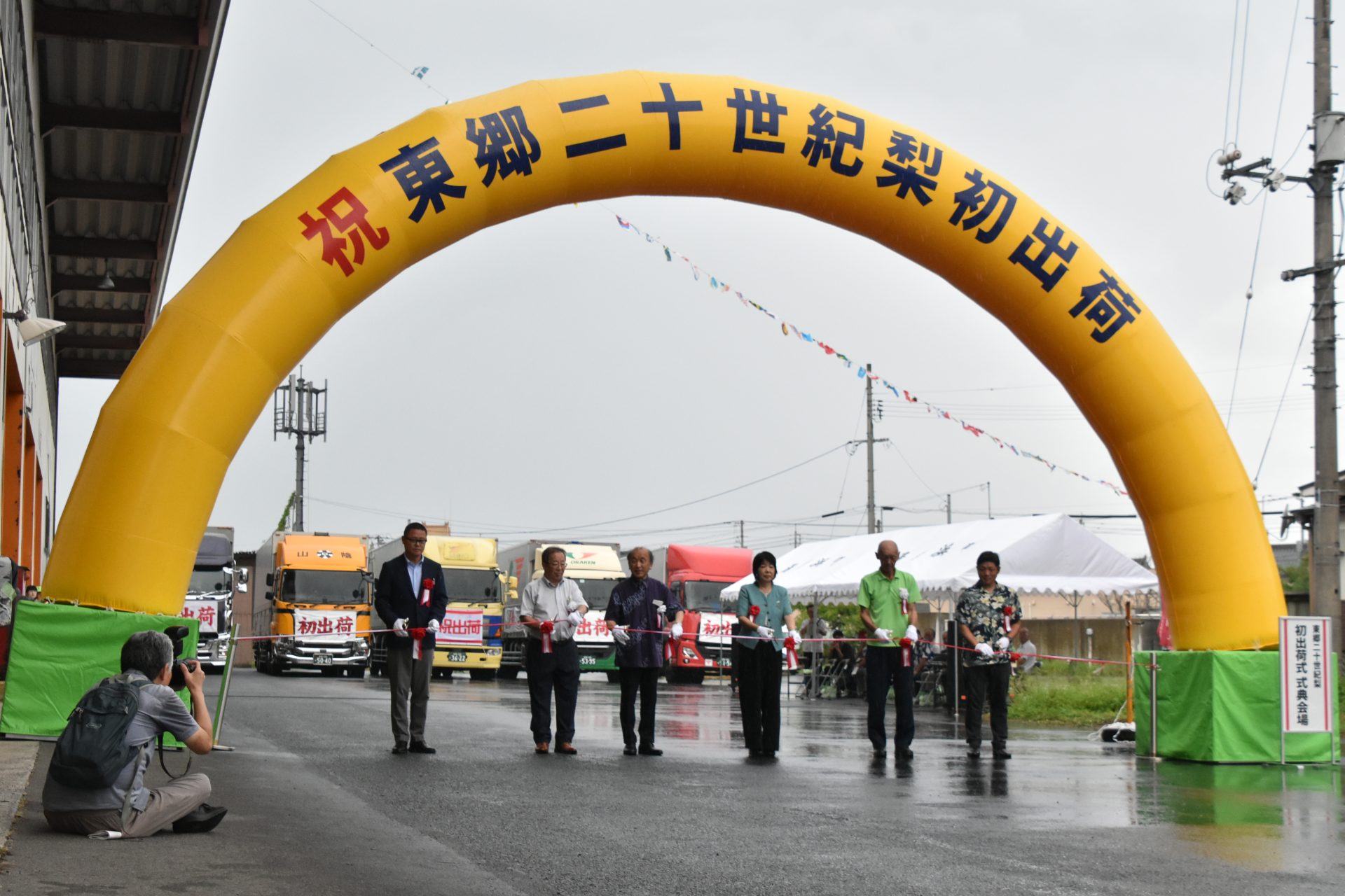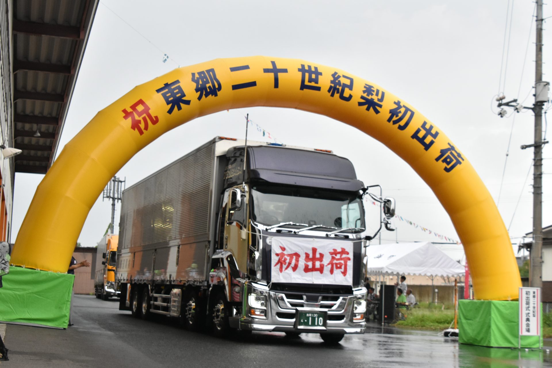 露地栽培の梨「二十世紀」の県内最大産地である湯梨浜町では、同町やJA鳥取中央東郷梨果実部が「東郷二十世紀梨初出荷式」を開催しました。同町の宮脇正道町長やJAの上本武組合長によるテープカットの後、初荷を乗せたトラックを関係者で見送りました。