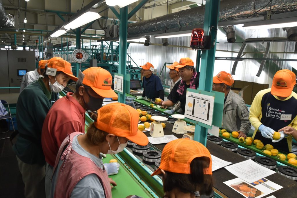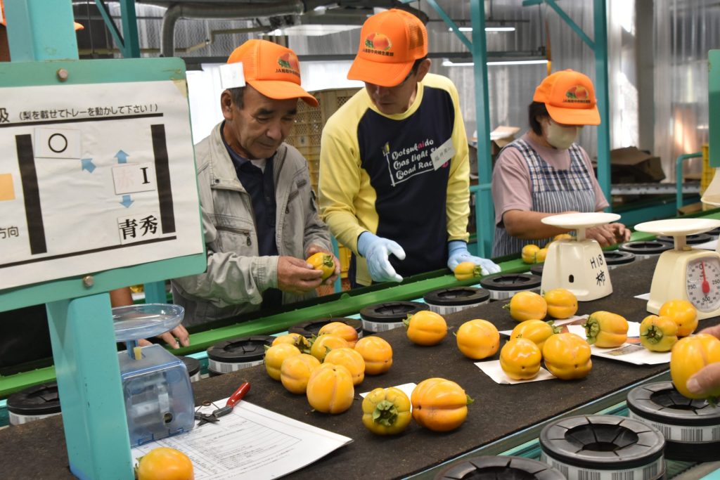初日のため、選果場では黄色く色づいた「西条」を目合わせし出荷規格を確認したのち、選果を開始。箱詰め時にドライアイスを同封し、3日間渋抜き処理を施した後、広島県を中心に県内市場などへ出荷しています。