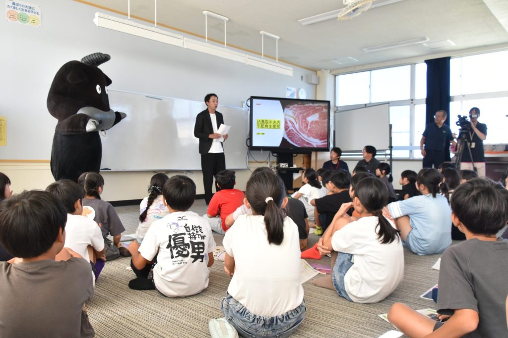 大栄小学校では、給食前の4時間目に、5年生を対象にJA鳥取中央肉牛肥育生産部の山根孝幸部長やJA職員による食育授業を実施。飼育過程などを紹介し、児童は命をいただく尊さについて理解を深めました。