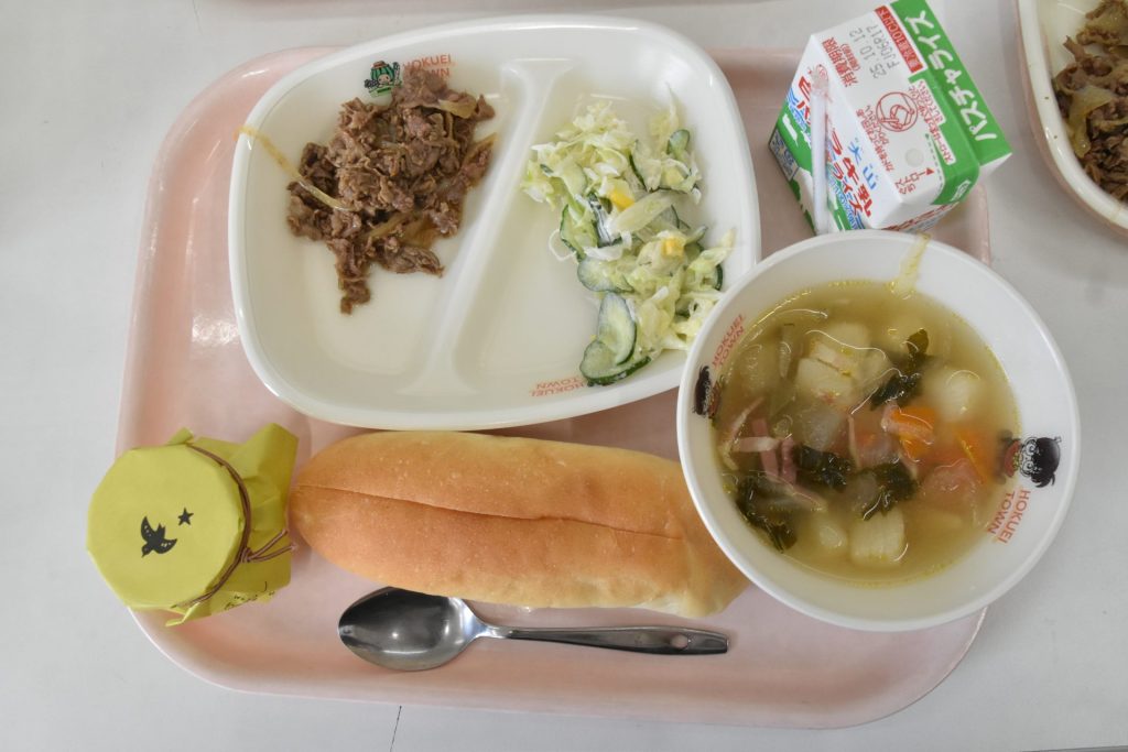 給食の時間になると、児童らは元気よく「いただきます」と手を合わせ、焼き肉ドッグにかぶりつき、5年生の上田さんは「お肉のタレがしみ込んでておいしい。牛にありがとうと言いたい」と話しました。