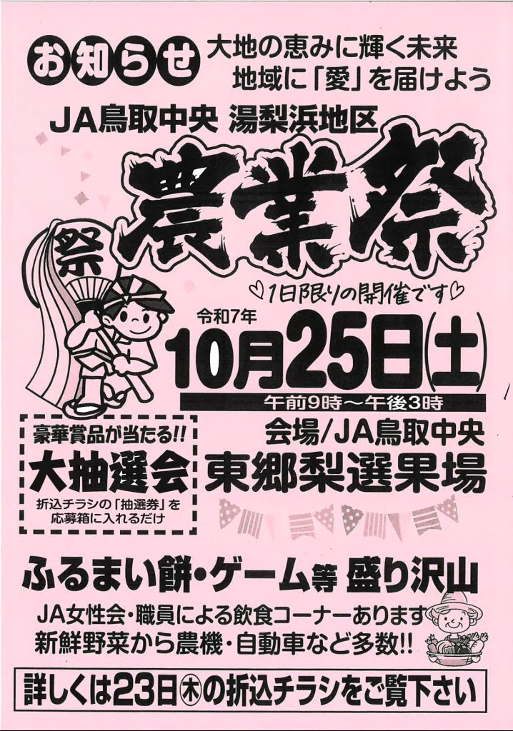 10月・11月は「国消国産月間」。JA鳥取中央では、地域の皆さまと秋の収穫を祝い、各地で JA収穫感謝祭(農業祭) を開催します。ぜひご来店お待ちしております。