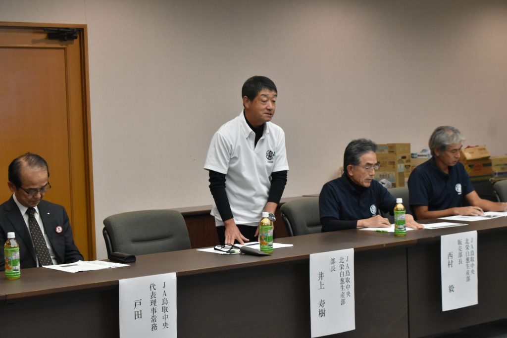 JA鳥取中央北栄白葱生産部は北栄町で、北栄白葱販売対策会議を開きました。取引市場4社と、11月初旬から出荷が始まる秋冬ネギの生育状況や販売計画を共有し、1ケース(3kg)当たり単価1700円を目指すことを確認しました。