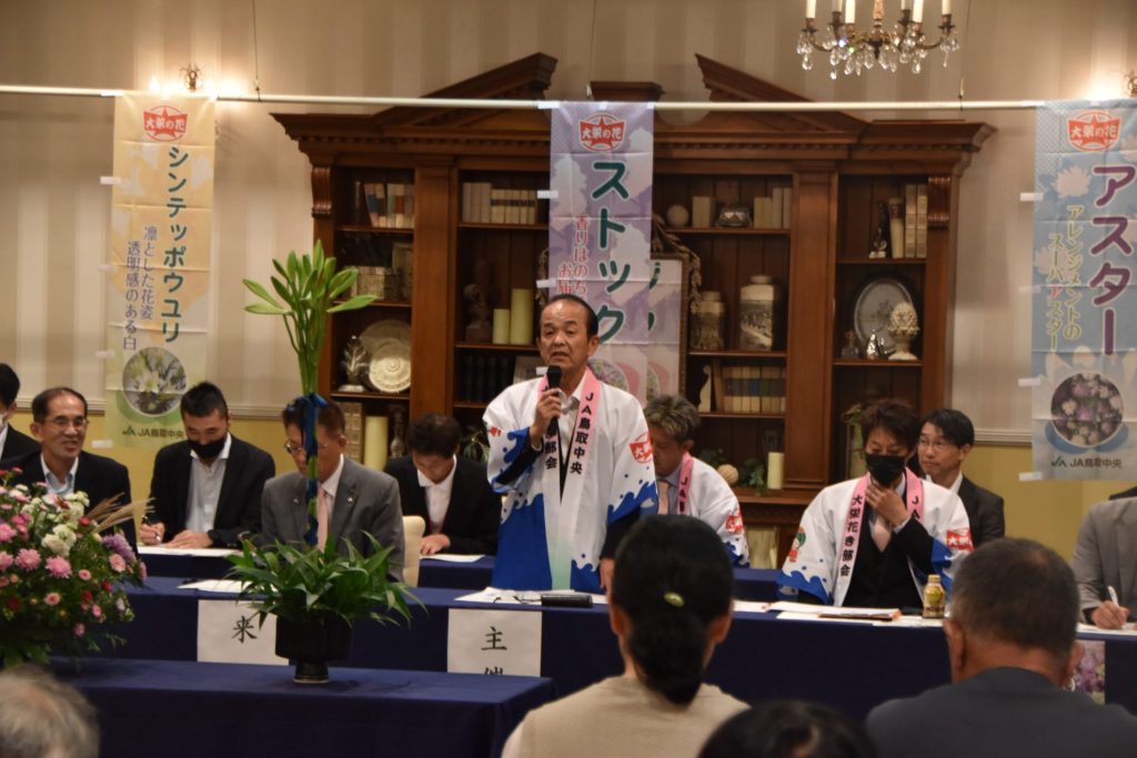 大栄花き部会は、倉吉市で2025年度大栄花き出荷取引会議を開きました。ストックや抑制シンテッポウユリ、抑制アスターについて、出荷の2日前に出荷予定数のデータを市場に送る「D2出荷」を継続して努めることを確認。本年度は、230万本、2億625万円の出荷、販売を目指します。