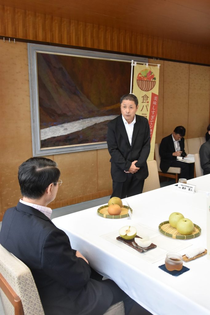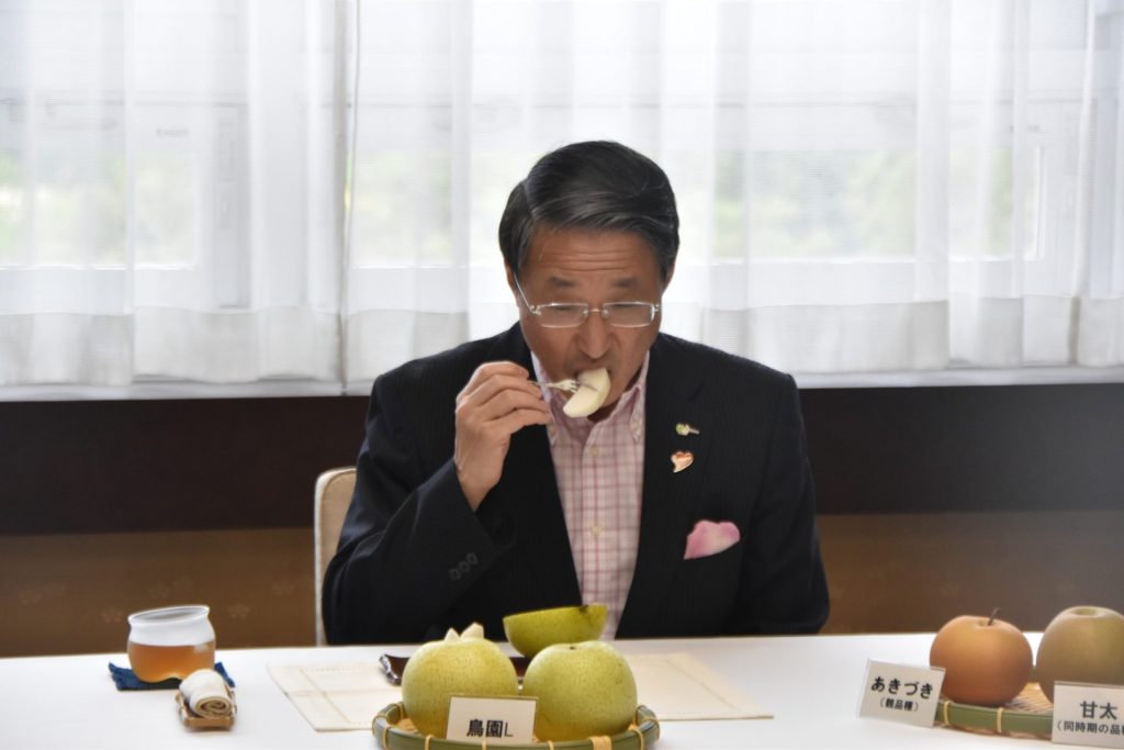 「鳥園L」を試食した平井知事は「鳥園Lを次なるスターとして、店の棚に県産梨が長く並ぶようにPRしていきたい」と話し、JA鳥取中央琴浦梨生産部の藤井憲人部長は「鳥園Lは短果枝が割りとよくでき、1年目から腋花芽が確保できるので豊産性がある」と話しました。