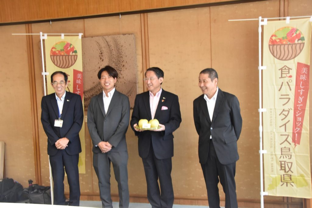 鳥取県が独自開発した青梨の新品種「鳥園L」の試験栽培に取り組む農家ら関係者が、県庁に平井伸治知事を訪ね、生育状況を報告しました。大玉で高糖度、さらに程よい酸味が特徴の「鳥園L」は、梨「二十世紀」を上回る濃厚な味わいが期待されています。