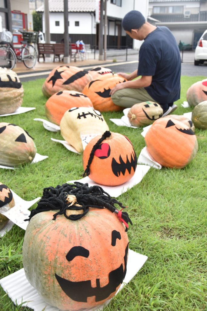 旬鮮プラザ満菜館は、ジャンボカボチャコンテストに出品されたカボチャをハロウィン風に飾り付け、店先で来店者を楽しませました。品種は「アトランティックジャイアント」で、計31点が並びました。最重量のカボチャに贈られる「でっかいで賞」は84kgの巨大カボチャを出品した中井くみ子さんが受賞しました。