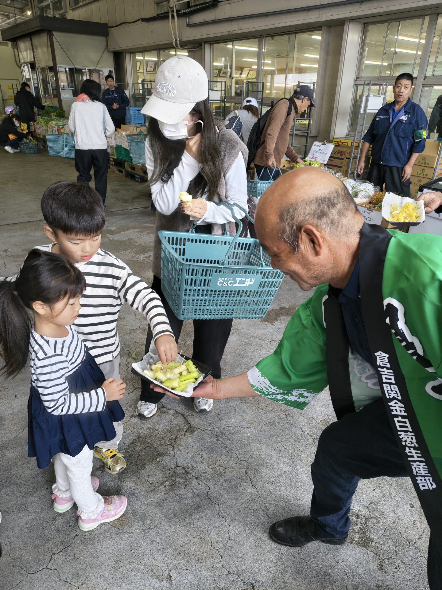 25日には、JA鳥取中央倉吉関金白ねぎ生産部が大阪府岸和田市の「岸和田青果土曜朝市」にも出店。前日には岸和田青果にて関西市場4社と中国市場1社を招き、販売対策会議を実施しました。朝市では、試食用に天ぷらを用意すると、「甘くておいしい」と好評で200束(1束3本)も販売できました。