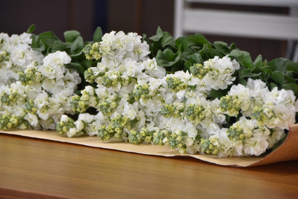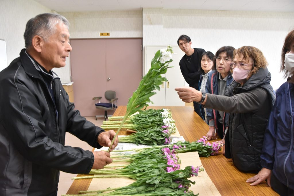 今年は、生育初期の天候の影響で葉の枚数が多くなり、開花時期の遅れが懸念されていましたが、査定会に持ち込まれた現物は、色・形ともに整った高品質なストックに仕上がっており、出席者は手にとってその出来栄えを確認していました。
