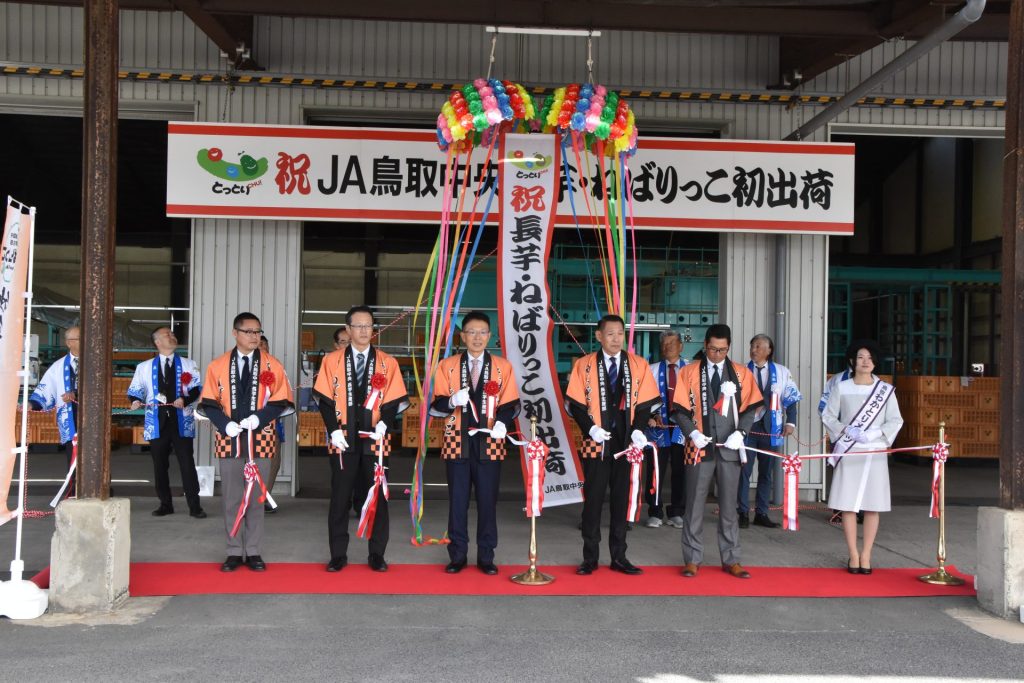 長芋生産部が北条砂丘で栽培する特産品「砂丘ながいも」と「ねばりっこ」の初出荷出発式を、同JA長芋集荷場で開きました。生産者やJA関係者がテープカットとくす玉で祝い、200ケース(1ケース10kg)を載せたトラックを見送りました。