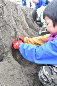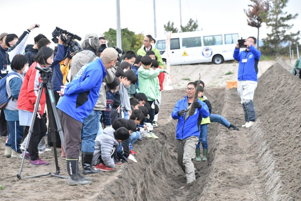 ほ場で、同部の竹本健二部会長が収穫の手順などを説明すると、児童らはバックホーで浅めに掘った溝に1列に並び一斉にスタート。1mほどに育った「ねばりっこ」の根本の砂を手でかき分け、1人2本ずつ収穫しました。体験した南場さんは「折れないように優しく掘るのが難しかった。給食が楽しみ」と話しました。