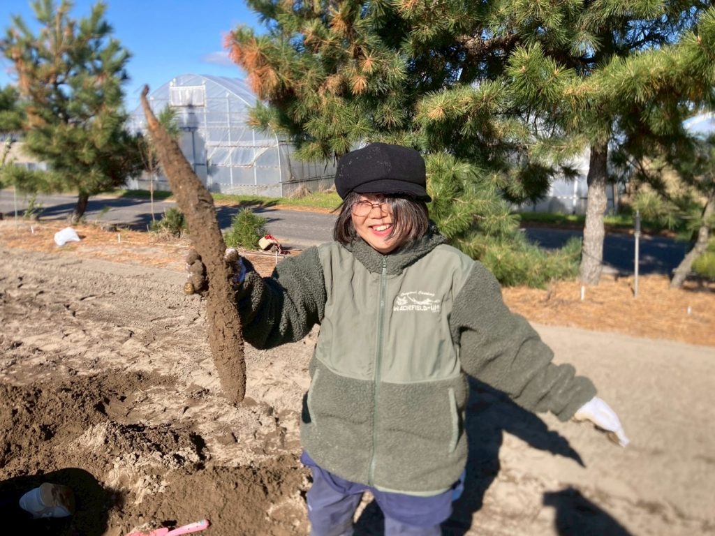 全国農協観光協会とJA鳥取中央は北栄町で、特産「ねばりっこ」の収穫体験を行いました。大阪から17人の参加者を迎え、バスで到着した一行は、秋晴れの空の下、園芸用スコップを手に1列に並び、1m近くある「ねばりっこ」を慎重に掘り出しました。