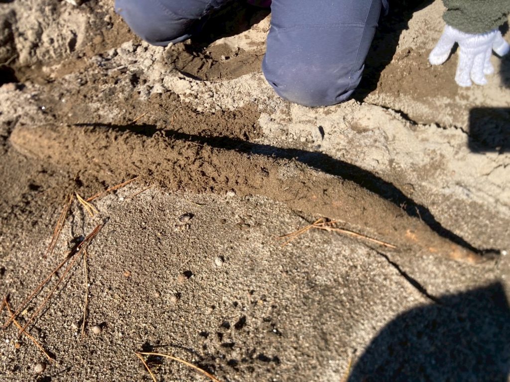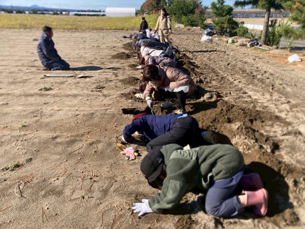 参加者は同JA長芋生産部の竹本健二部会長の圃場で、一人一本ずつ収穫し、「思ったより深く掘らないといけなくて、手が届かなかった」と収穫の喜びと達成感を味わっていました。