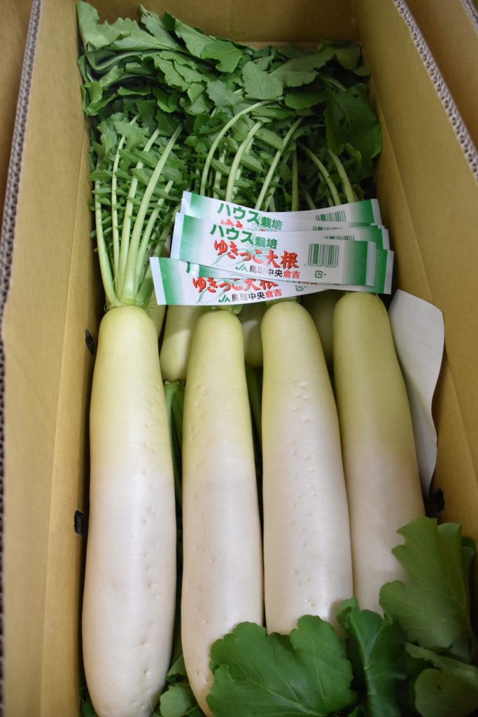 現在出荷しているのは9月下旬ごろに定植した分で、例年通り雪のように色が白く、きめ細かな肌に仕上がっています。ゆきっこ大根は、倉吉西瓜やメロンの後作としてハウスで栽培します。雨水を吸収しやすい露地栽培に比べて水分を抑えて栽培するため、おでんなどの煮物にするとよく味が染み荷崩れしない柔らかい食感に仕上がります。また葉付きで出荷するのも特徴で、鮮度がよく葉までおいしいとリピーターも多いです。