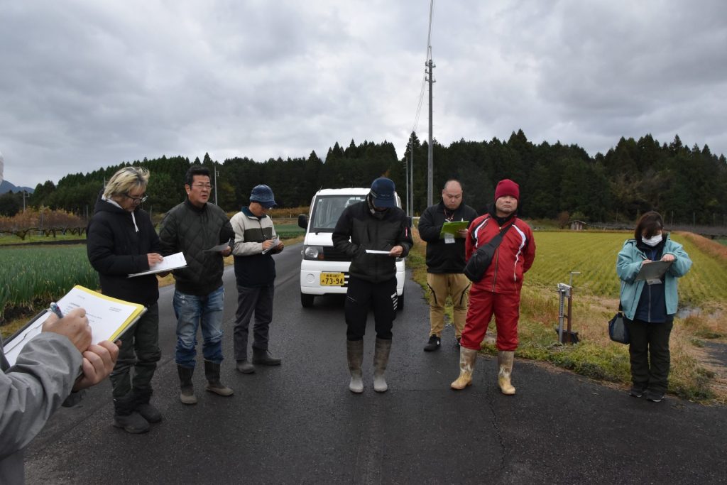 一行は、前田直樹さんと海地道雄さんの圃場を視察し、生育状況や排水対策などを見学しました。