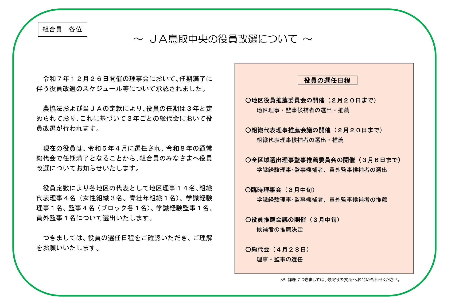 現在の役員は、令和5年4月に選任され、令和8年の通常総代会で任期満了になることから、組合員のみなさまへ役員改選についてお知らせいたします。