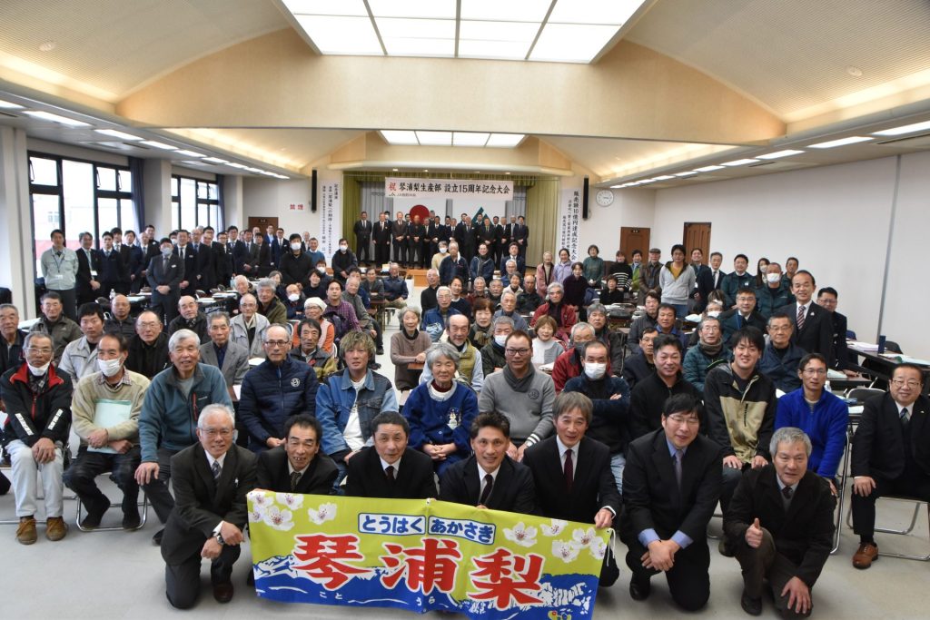 琴浦梨生産部は、琴浦町で設立15周年および販売額10億円達成の記念大会を開催しました。生産者や市場関係者、行政関係者ら約150人が出席。15年間の歩みを振り返るとともに、大台突破の節目を祝い、さらなる産地の発展を誓い合いました。式典では、これまでの軌跡をまとめた「15周年記念誌」を参加者に配布しました。