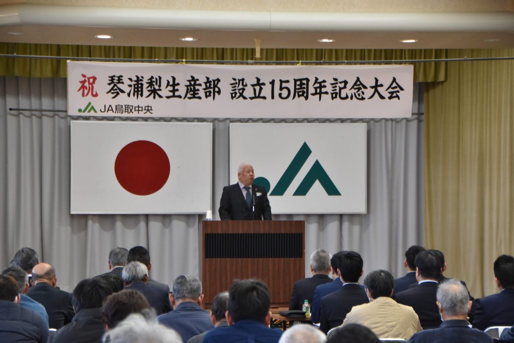 記念講演では、大果大阪青果株式会社の植田部長が「琴浦梨への期待~市場観点からの産地要望~」と題して登壇。市場流通の現状や、消費者ニーズに応える産地づくりの重要性を説きました。同部の藤井憲人部長は「年々辞めていく方が多いが、一方で新しく梨作りに挑戦する若い入会者が増えている。若手を育成し、活気ある産地の維持に全力を挙げたい」と意気込みました。