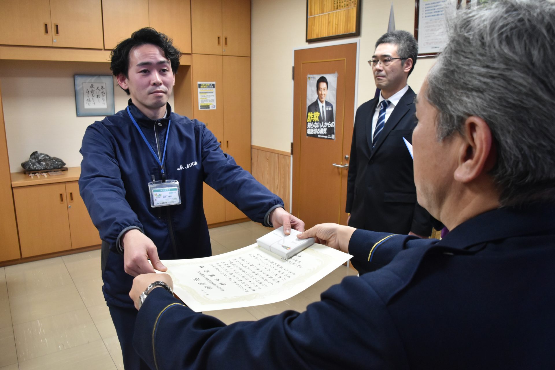 その後警察が、詐欺商法とみられる訪問販売事案の疑いがあるとして被害を未然に防止した。櫨本さんは「組合員に安心を届けることが使命と思い、普段から困ったことがあったら相談してくださいと声をかけている。感謝状をいただけて嬉しい」と話しました。