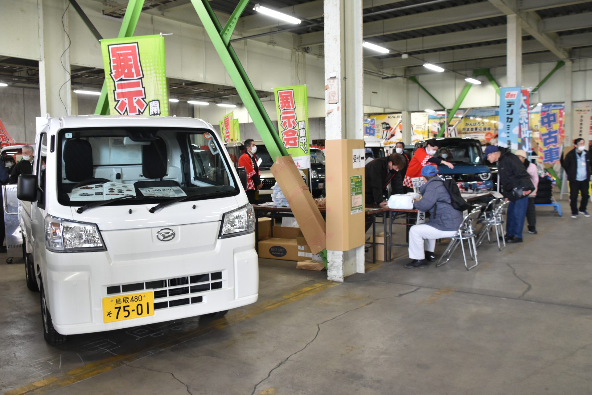 自動車では主にスズキや三菱などの車両をメインに展示し、特別価格での販売も実施しました。