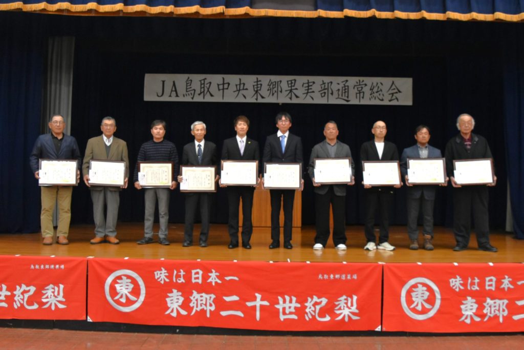 会の中で、湯梨浜町うまい梨づくり共進会表彰を実施し、特別表彰には3年連続で唐﨑大義さんが輝きました。