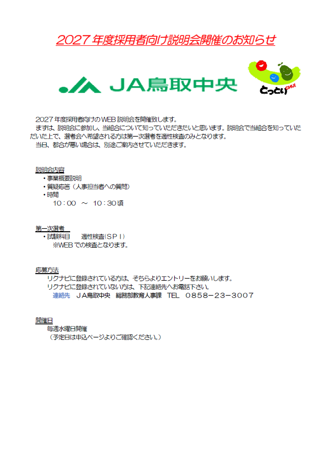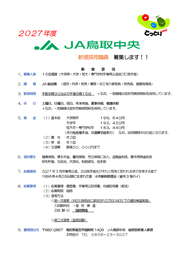 2027年度 JA鳥取中央新規採用職員募集のお知らせ